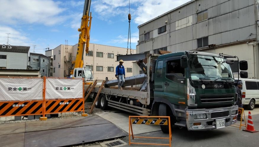 基礎工事が終わり、今日から鉄骨の搬入です。