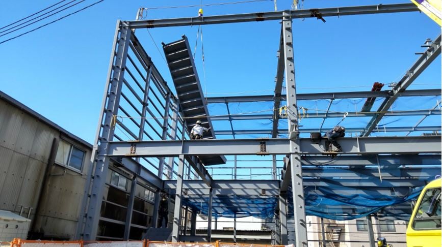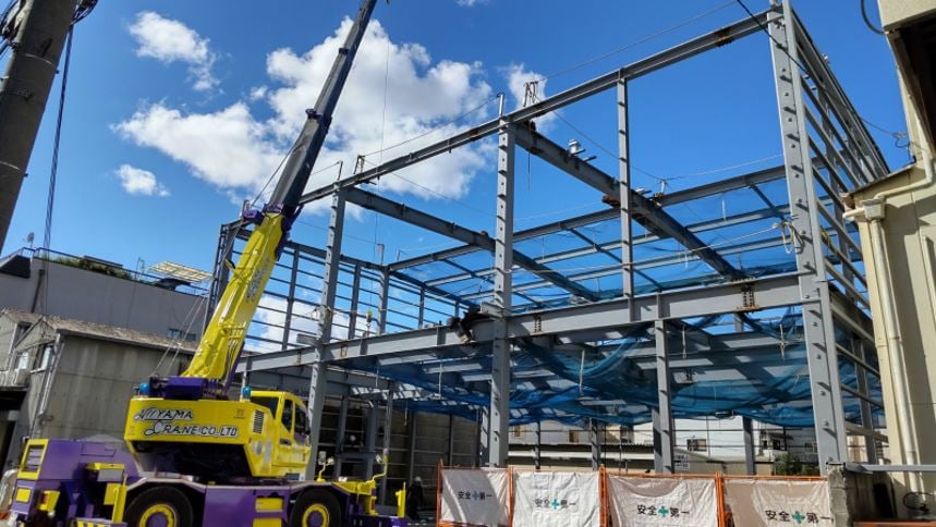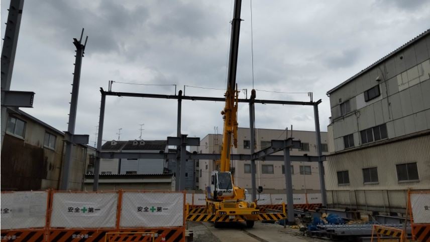 鉄骨を吊り上げて奥の方から組立て行きます。